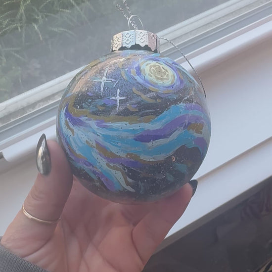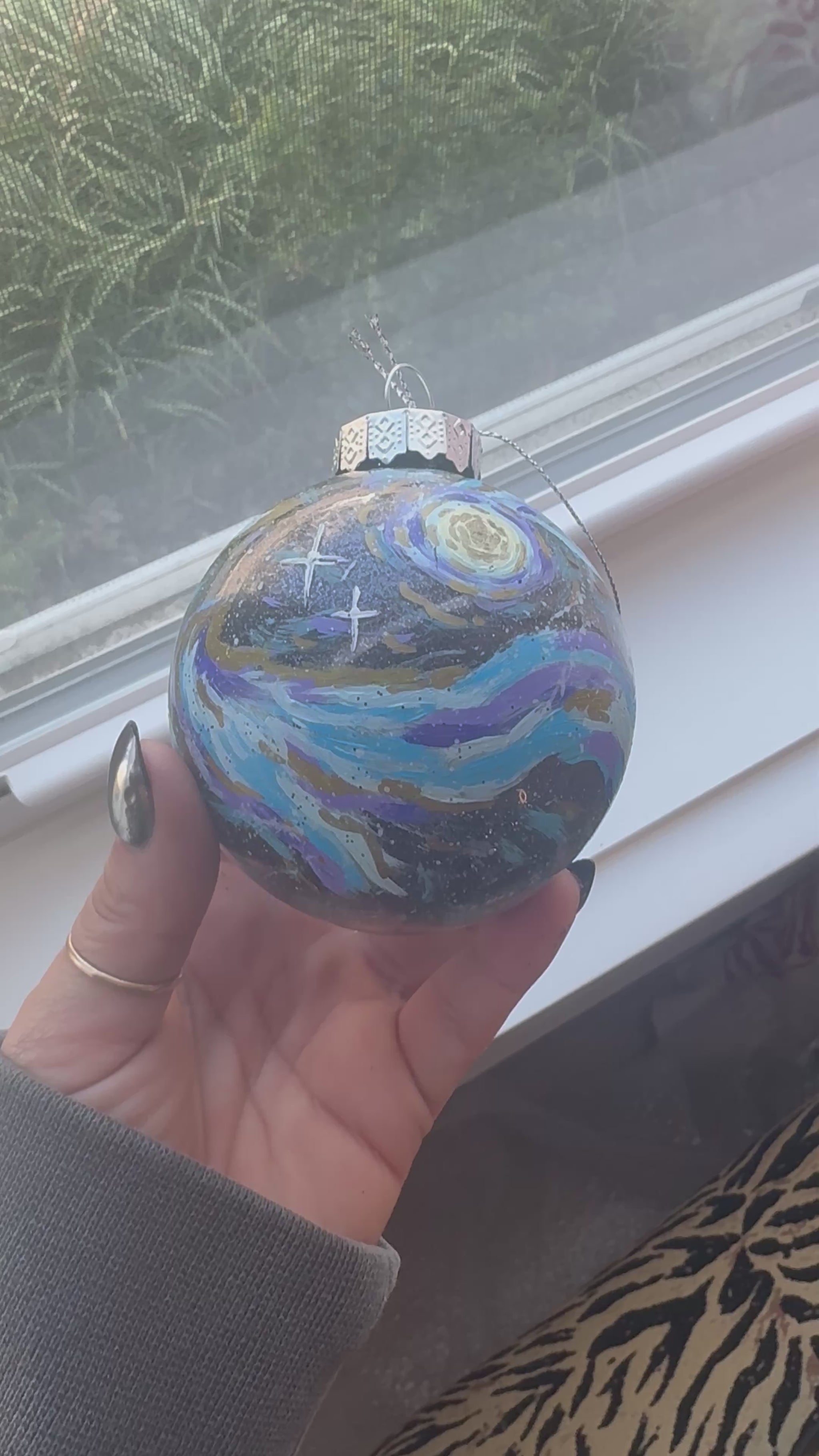 Inspired by our beautiful galaxy, this ornament features swirling blues, purples, and golds with hand-painted stars glimmering across a celestial night sky. Artistic, vibrant, and a true statement piece for any tree or holiday display.